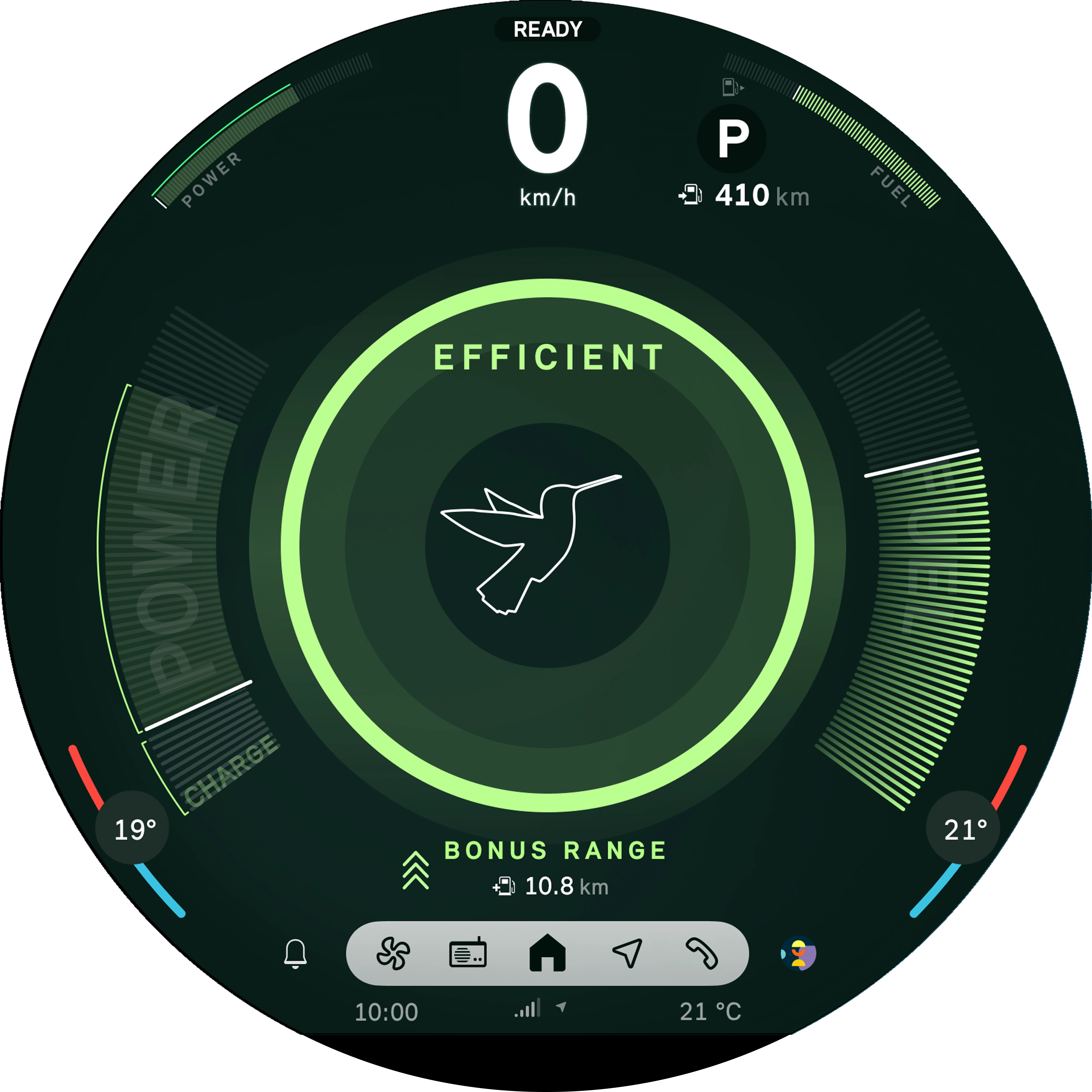 L’Efficient Mode (mode « efficacité ») favorise un style de conduite qui réduit la consommation et les émissions. Il ajuste ainsi les fonctions de confort telles que la climatisation et la régulation du moteur. Dans l’interface utilisateur, vous pouvez voir l’autonomie supplémentaire obtenue.